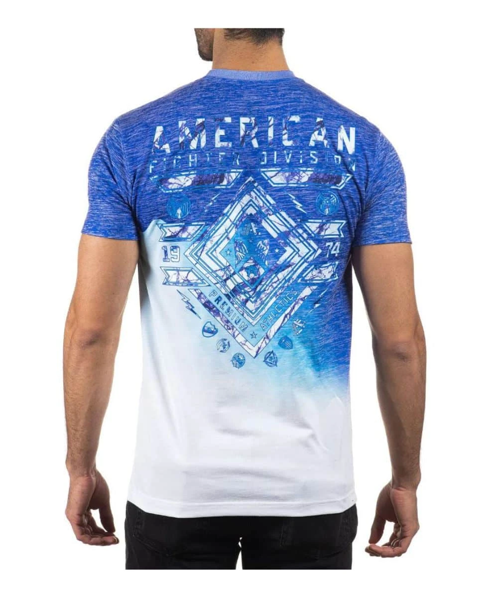 55% Cotton/ 45% Polyester; Color: Blue Fading To White; White And Navy Waterbase Ink; Short Sleeves; Crew Neck; Tagless Neck; Style #FM13340