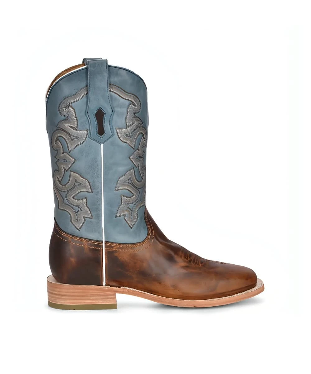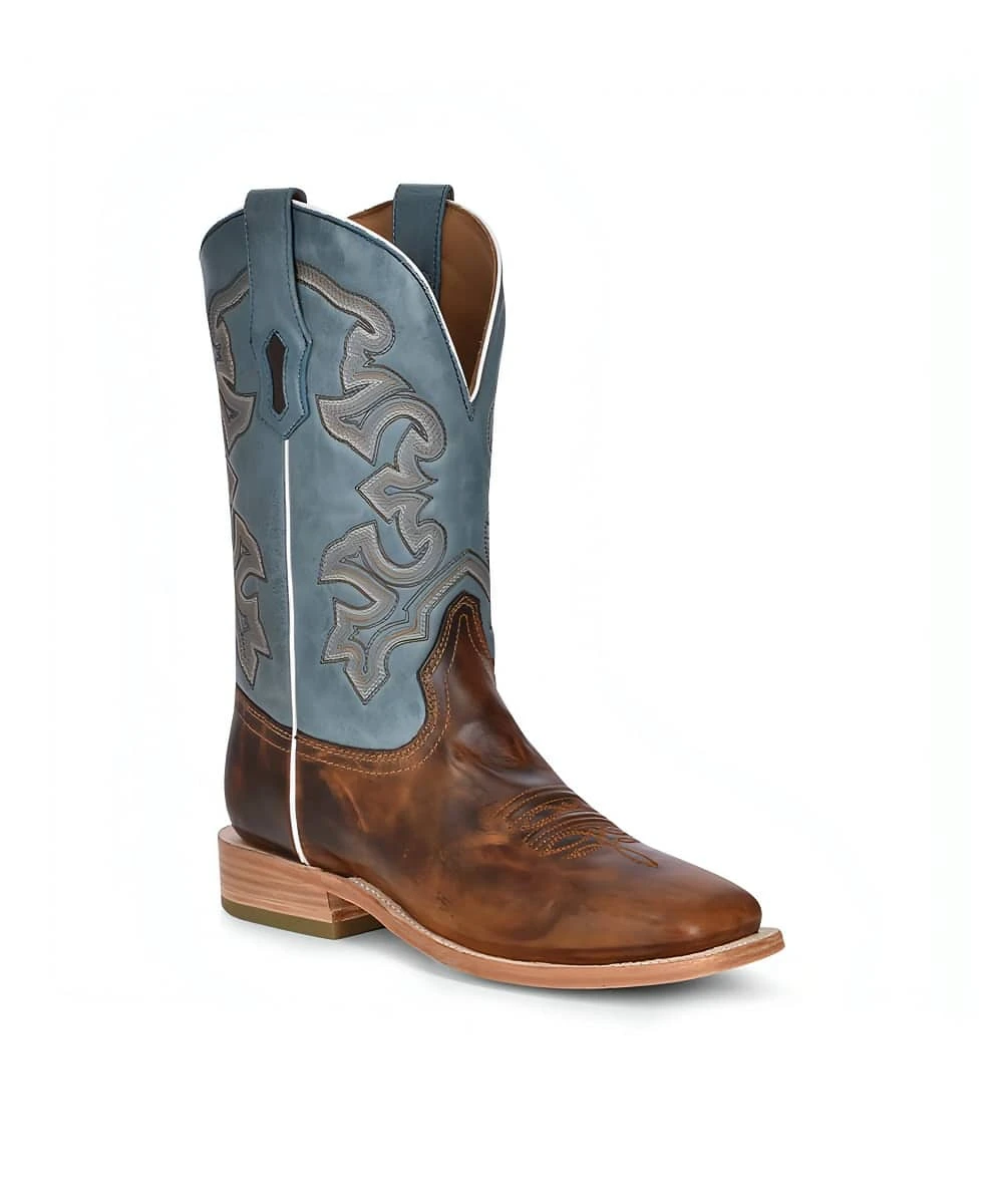 12″ Shaft; Leather Lining; Color: Deep Honey Vamp/Blue Shaft; Multi Row Stitching; Pull Straps; Cushioned Leather Insole; Wide Square Toe; 1 1/2″ Fiberglass Heel; Leather Outsole; Style #A4262