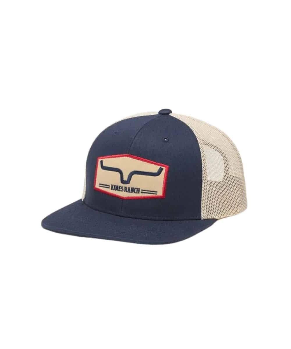 6 Panel Construction; Navy Front Panels And Brim; Navy, Tan, And Red Kimes Ranch Logo On Front Center; Tan Mesh Back Panels; Snap Back Closure; Style #REPLAY TRUCKER NAVY