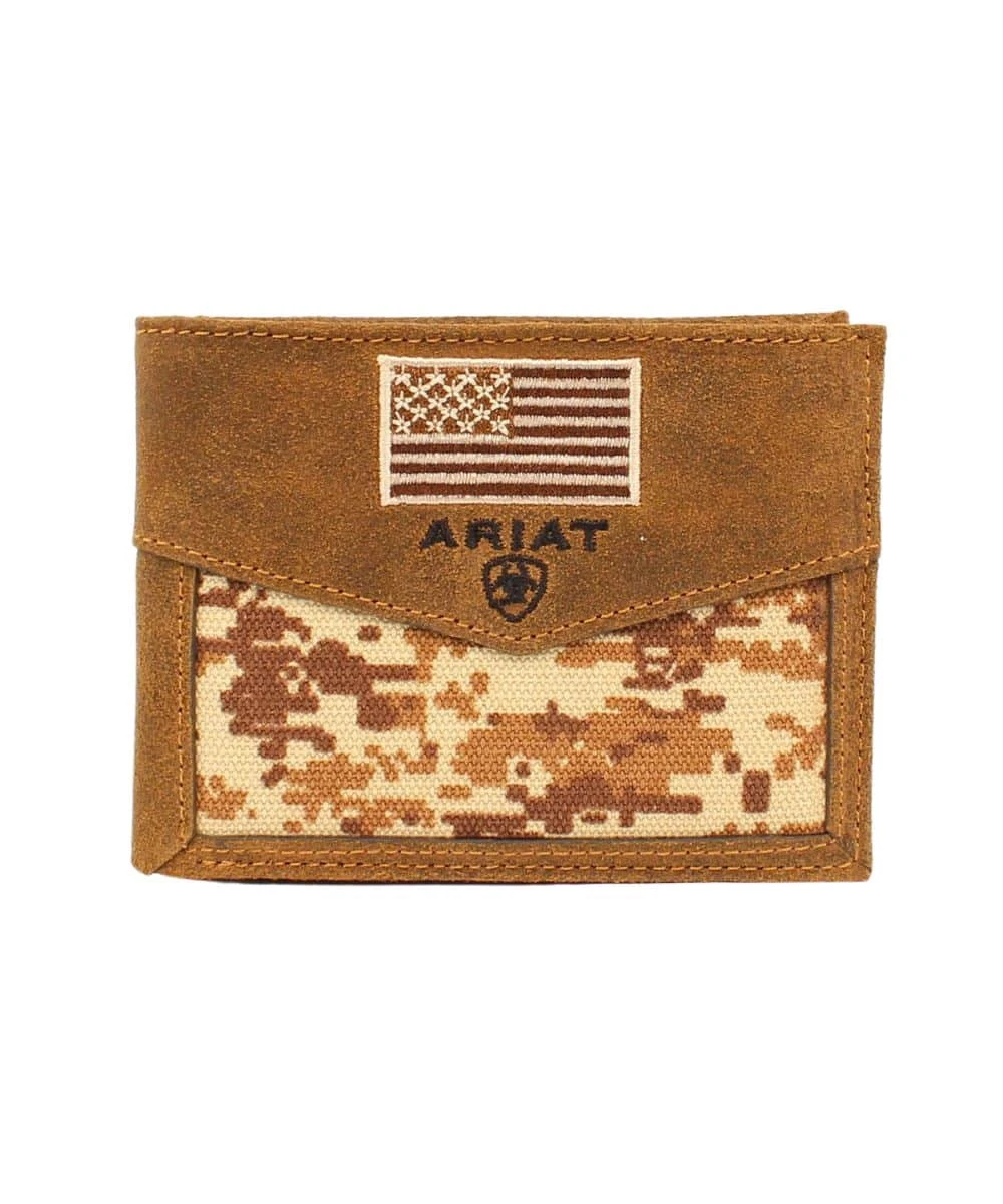 Top Grain Leather; Digital Camo Center; American Flag Embroidery And Ariat Logo Above Digital Camo; Multiple Card Slots; Cash Compartment; Removable Photo Slip; Clear ID Window; Style #A3536844