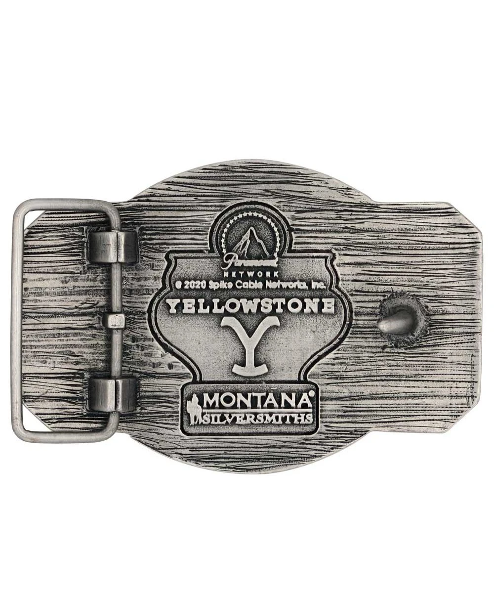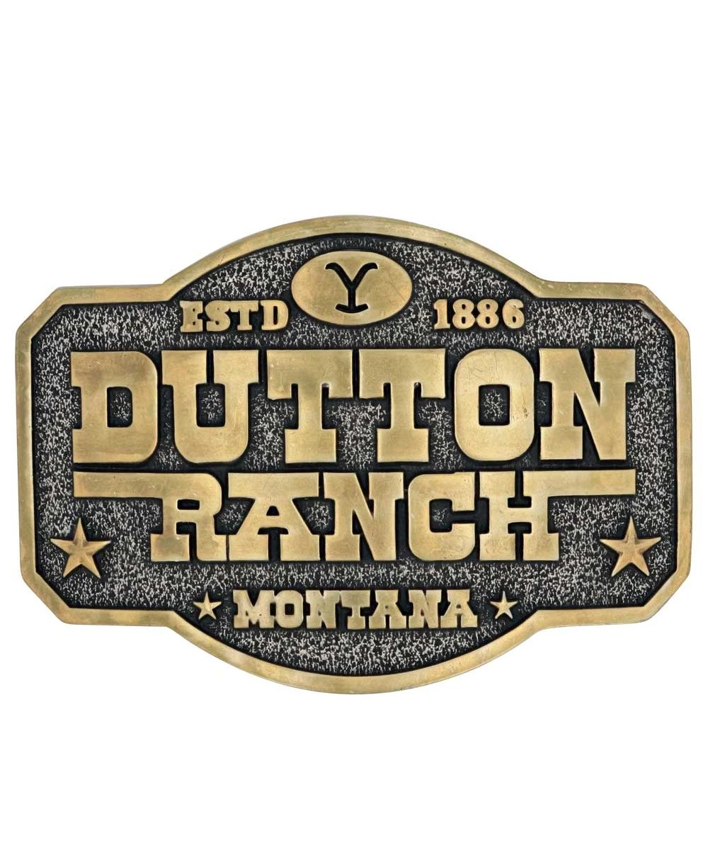 Silver And Gold Over White Metal Alloy; Scalloped Shape Belt Buckle With Clipped Corners; Antiqued Silver Background With Black Hand Paint And Gold Toned Trim; Face Of Buckle Reads: “Dutton Ranch ESTD 1886 Montana”; Western Style Stars In Corners; Standard 1.5″ Belt Swivel; Measures Approximately: 4.25″ W x 2.93″ H; Style #A910YEL
