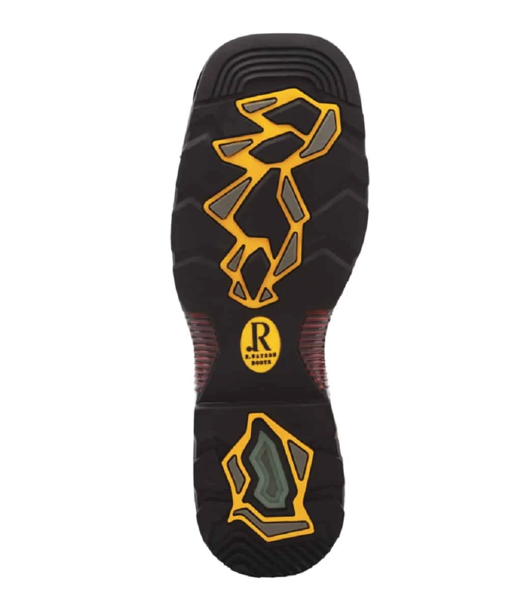 12″ Boot; Waterproof Hazel Bay Cowhide Leather; Orange And White Ten Row Stitch Pattern; Embroidered Orange Pull Holes; Removable Orthotic Insole; EVA Midsole; Block Heel; Square Toe; Slip And Oil Resistant Outsole; Electrical Hazard Rated; Style #RW1010-WP
