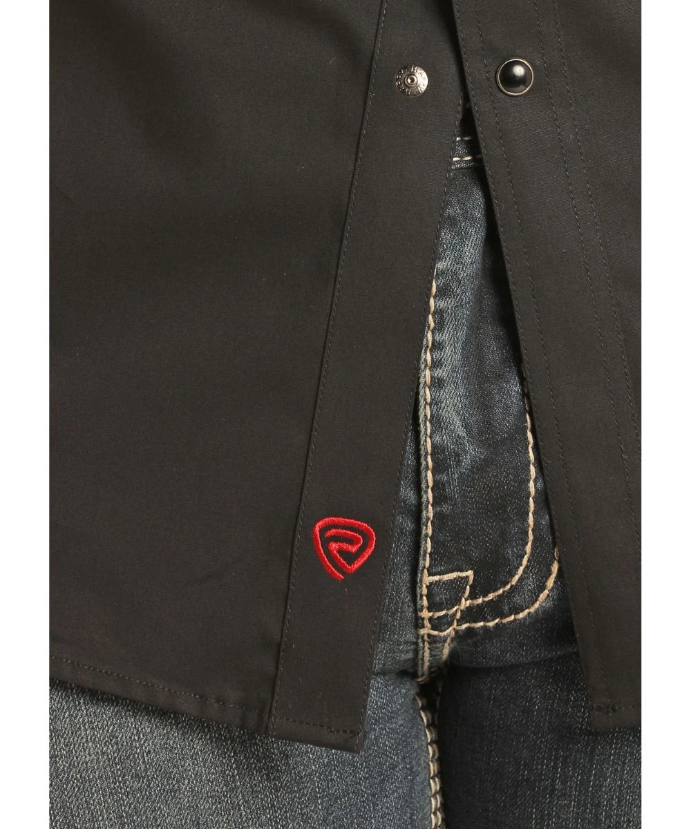 97% Cotton/3% Spandex; Woven Stretch; Modern Fit; Long Sleeve; Spread Collar; Snap Front Placket And Cuffs; Black Pearl Snaps; Dual Single Point Snap Flap Chest Pockets; Single Point Front And Back Yokes; Mexico Flag Colored (Green, White, And Red) Logo Embroidery On Right Sleeve; Color: Black; Style #RRMSOSR0QT