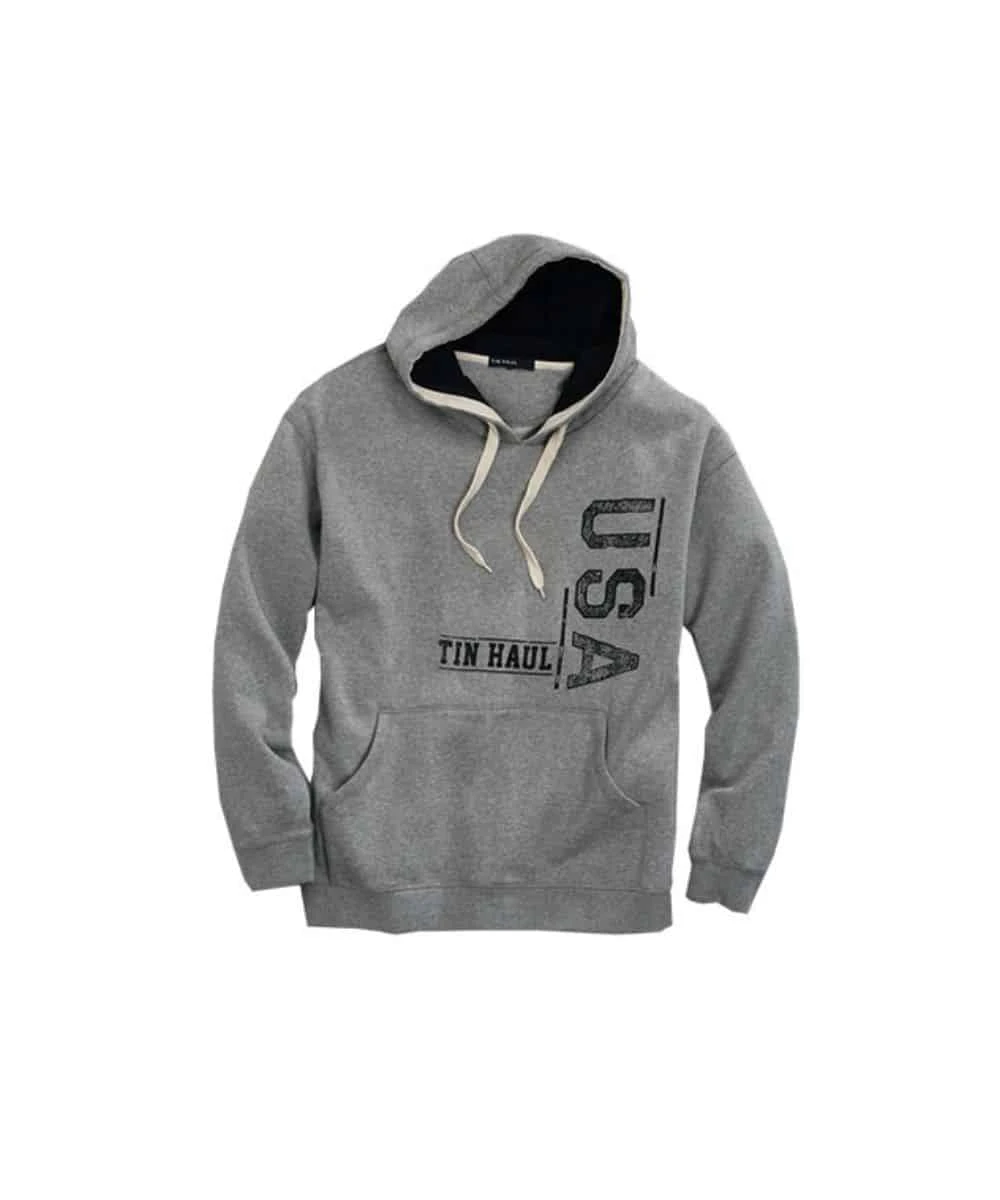 75% Cotton/ 25% Polyester; Color: Charcoal Gray; Fleece Knit; Hooded Sweatshirt With Drawstring Closure; 3 Panel Jersey; Hood Lined In Black; Gusset Under Arms; Kangaroo Pocket; Rib Knit Waistband And Cuffs; Black “Tin Haul USA” Screen Printed On Front; Style #10-097-0300-0873