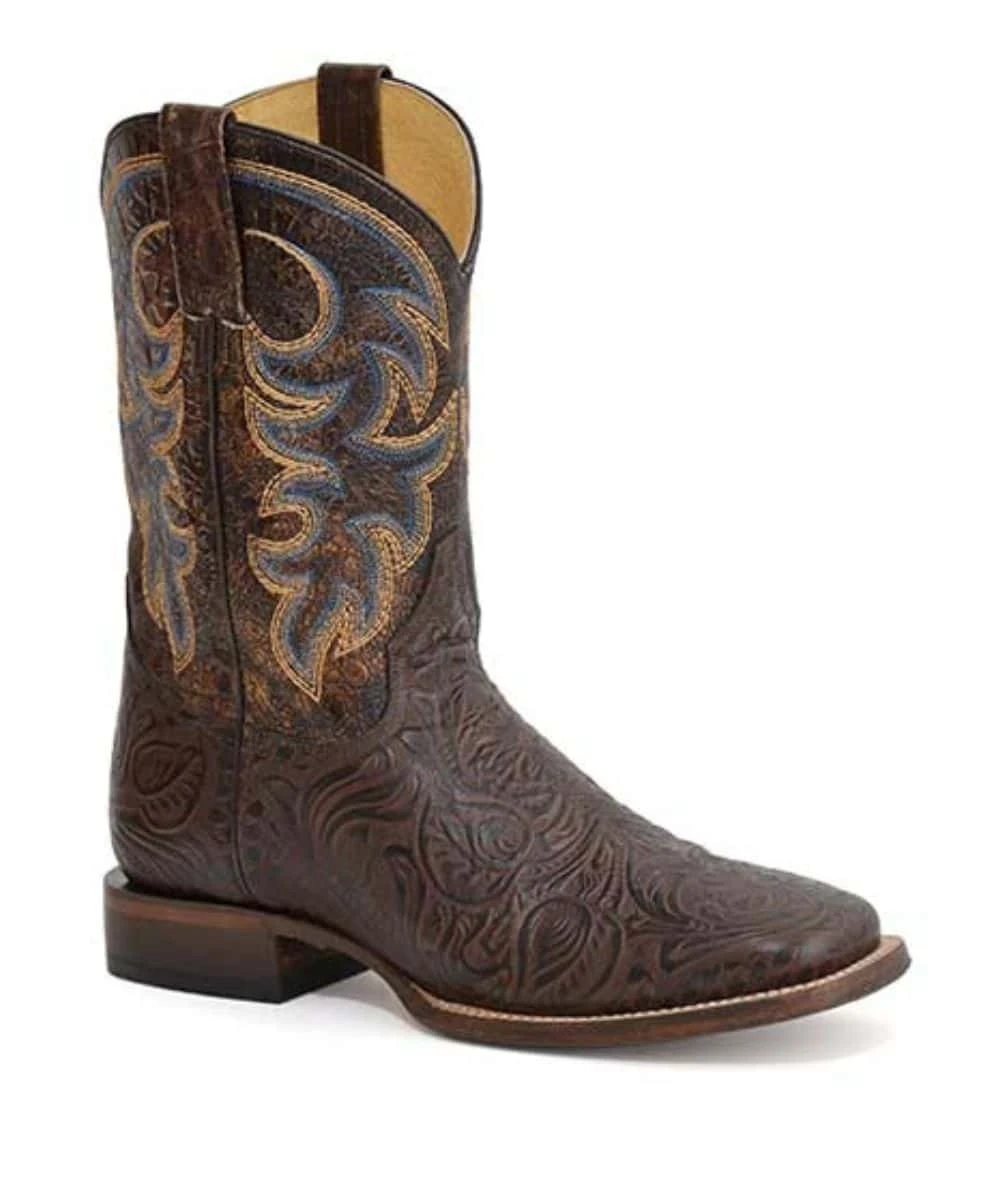11″ Shaft; Embossed Hand Tooled Leather Vamp; Vintage Leather Shaft; Double Welt; Leather Lining; Leather Walking Heel; REST Removable Insole; 3/4″ Welt Sole With Nails And Lemonwood Pegs; Leather Outsole; Square Toe; Color: Brown; Style #09-020-7022-8355