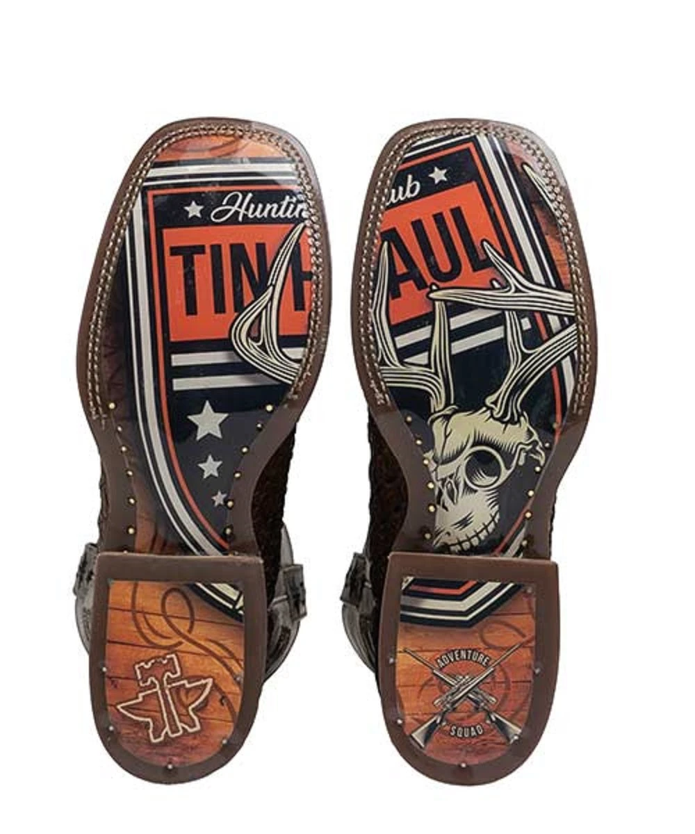 11″ Shaft; Burnished Leather; Brown Hand Woven Vamp; Burnish Gray Shaft; Leather Lining; Obvious Comfort Removable Insole; Tin Haul Logo Shaft Stitching Design; Double Welt; Tin Haul Logo Pulls; 1 3/8″ Walking Heel; Square Toe; Obvious Leather Sole Images Of Buck Skull With Tin Haul Logo; Style #14-020-0077-0440