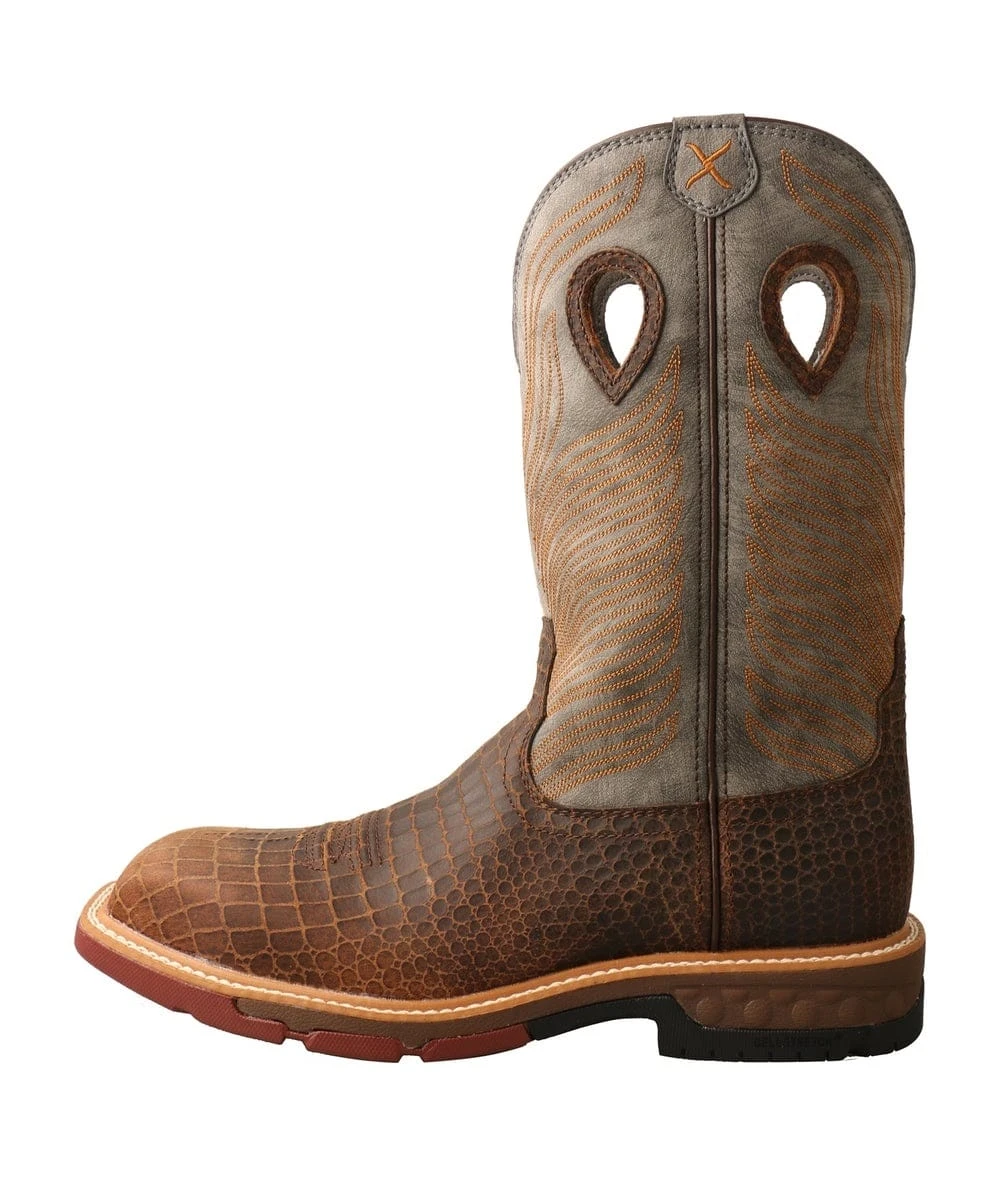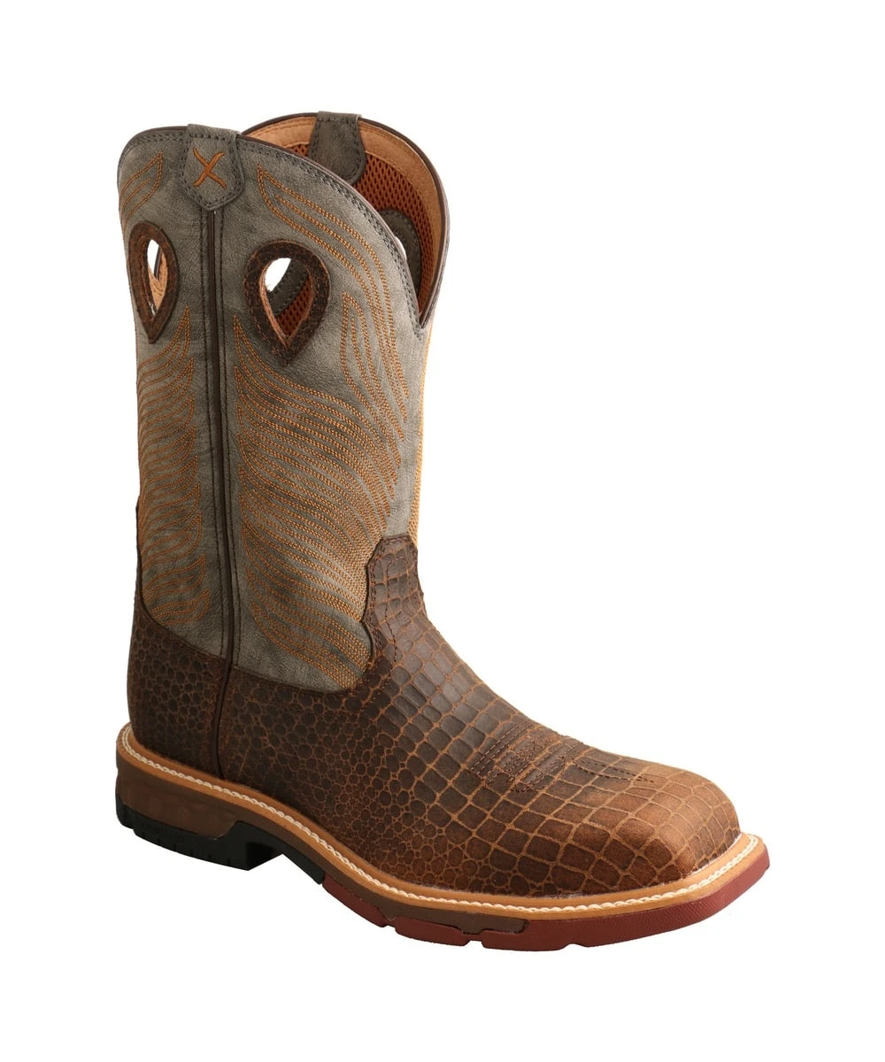 12″ Shaft; Full Grain Leather; Leather TWX Shaft With Taped interior Seams; Leather TWX Material Utilizes 80% Recycled Leather That Would Otherwise End Up In Landfills; Air Mesh Lining; Reinforced Pull Holes; Molded Footbed; Compression Molded EVA Midsole Integrated With Molasses Which Reduces The Amount Of EVA Used; CellStretch Technology Utilizes Cells In The Forefoot And Heel To Provide Cushioning And Comfort; Double Stitched Storm Welt; Nylon Glass Fiber Shank; Nano Composite Safety Toe; Wide Square Toe; 1 1/2″ Block Heel; Electrical Hazard Rated And Oil And Slip Resistant Molded Rubber Outsole; Nano Composite Safety Toe Meets ASTM F2413-18 M/I/C And EH Standards; Color; Brown Foot/Gray Upper With Orange Accent Stitching; Style #MXBN005