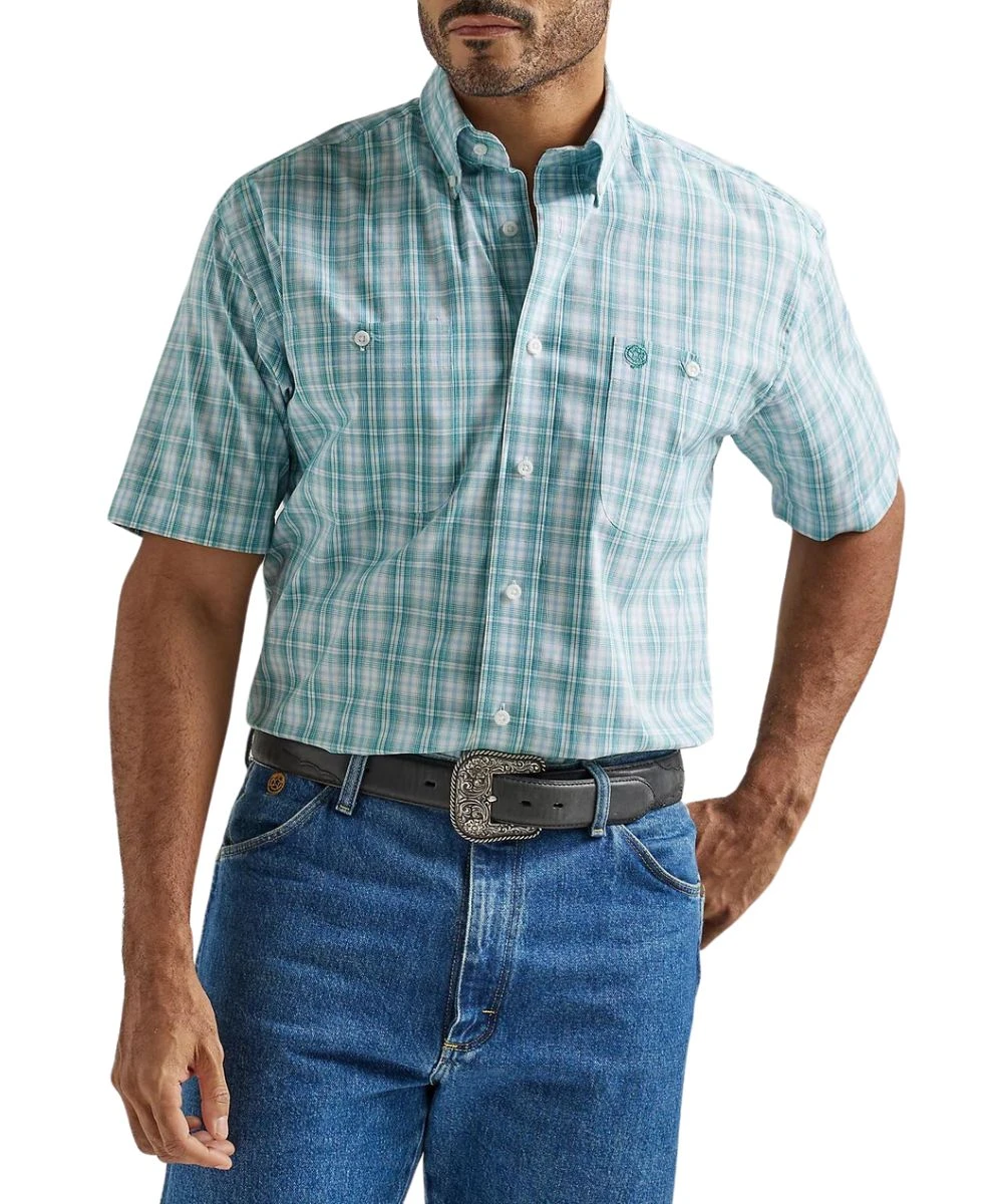 85% Cotton/15% Polyester; Short Sleeve; Button Down Collar And Placket; Dual Button Through Chest Pockets With Logo Embroidery; Straight Back Yoke With Box Pleat; Turned Hem Tails; Color: True Aqua Plaid; Style #112327822